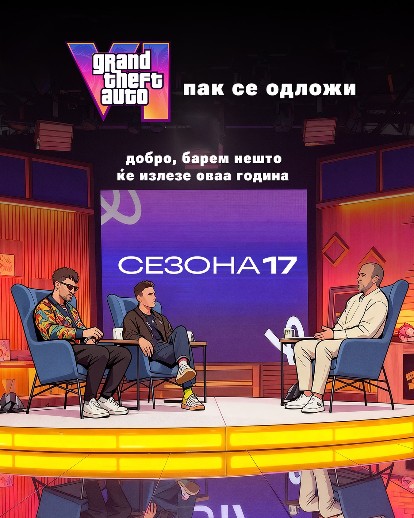 Најпопуларното македонско ТВ шоу се враќа со нова, седумнаесетта по ред сезона! И оваа сезона ќе го продолжиме истиот концепт од минатите неколку сезони, то ест, телевизискиот дел од нашето шоу ќе биде поделен на два дела кои ќе може да ги гледате секоја недела во 18:30 на Канал 5. А интернет верзијата ќе биде составена од двете ТВ епизоди+материјал што претходно не бил емитуван на телевизија. Поткаст т.е. интернет верзијата (за сами да си одберете дали сакате да ја гледате и слушате или само слушате) на нашата емисија ќе биде достапна секоја втора недела во 20 часот на нашиот Youtube канал.